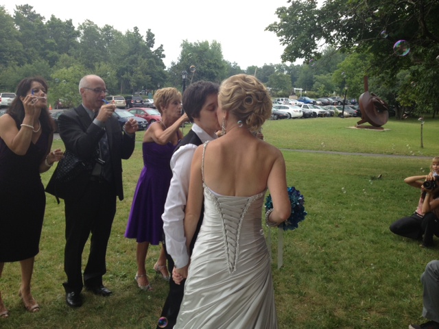I like a couple that doesn’t mind a little rain! And that couple was Amber and Kristen on Saturday July 27 outside of the Albright-Knox Art Gallery. Although there was only a tiny sprinkle coming down, it could have sent some couples running. Amber and Kristen have been waiting a decade to be married and a little drizzle wasn’t about to stop them! We gathered outside with their closest friends and family as Amber and Kristen gazed into each others eyes and finally made it official. Their readings were meaningful and hilarious and you could tell everyone was so happy to be gathered there. After their kiss they were surrounded by bubbles as everyone (myself included) blew our good luck towards them. Congratulations Kristen and Amber. I’m so glad I was able to share in your beautiful moment!