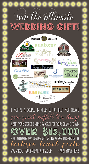 The Boutique Bridal Party, Buffalo’s only indie bridal organization, will hold their annual bridal show on February 27th 2014 at the Hotel Lafayette where they will be giving away over $15,000 in prizes towards a dream wedding to a couple in need. The Buffalo community is at the heart of the Boutique Bridal Party, which is why this year the talented vendors participating in the event are donating their time and services to one lucky couple! Everything from the engagement photos to the wedding favors will become a reality for a bride and groom who have been forced to put their dreams on hold.