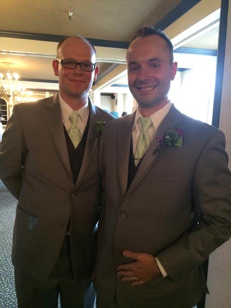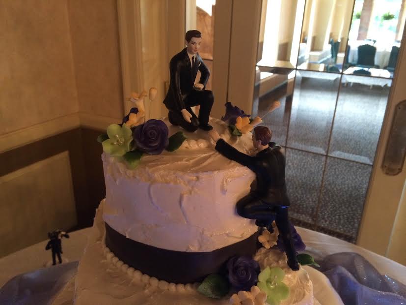 What were you doing on Friday June 13th? Were you feeling superstitious and hiding out? Not Eric and Jim. They embraced Friday the 13th AND a full moon and made it into their wedding day! And even though there was some rain outside, they didn’t seem to mind. Inside the Brierwood Country Club, all was dry and warm and full of love. Guests mingled about either trying to love up on the grooms, or looking at the madlibs Eric & Jim created. Madlibs! Not to mention, I found my favorite cake topper yet! Soon we were ready for the big moment, and the loud techo music let us know this wasn’t like other weddings. I’m surprised I made it through the ceremony because we kept stopping to laugh. The two of them are hysterical! Towards the end of the ceremony they had their own signature cocktail ceremony where they mixed up a special Blue Curaçao drink. I wish I was able to stick around so I could have tried it. It looked amazing. Finally, after the jokes ended, they looked at each other seriously and embraced for their wedding kiss. It was a beautiful moment and I was so happy to have been there. Congratulations Jim & Eric! I’m so happy I met the two of you and enjoyed every moment we had together. Best wishes for more happy decades together.