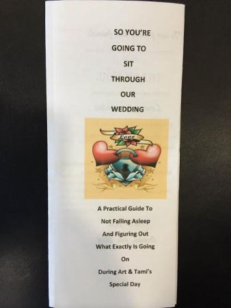 When I first met Tami and Art, they loved kidding around about how long they had been together and how it was taking a long time to get down that aisle. After a decade together, they decided to finally make it official (and make the dogs legitimate) by getting married on October 4th at the Avant Embassy Suite Hotel in downtown Buffalo. Being such a fun and lighthearted couple, they let me know they had something special in store for their ceremony that their guests were unaware of. When I arrived and found Art, he showed me what they had in mind and I burst out laughing. Since it had taken so long for them to arrive at this moment, when I read their vows to them and they repeated, they were going to come from a children’s book called “It’s About Time.” I knew their guests were going to love that! Not to mention their program had me in stitches. Check out the image below and you’ll see why. Tami looked just as ready as Art to start the show, so moments after checking in with her, the guitar started and a live singer began belting out “At Last” by Etta James. Seeing a pattern?! Tami walked up to meet Art and they kept making faces at and teasing each other throughout. I love moments like that. They weren’t nervous at all because they knew what they were doing. Soon it was time to pull out the book, and their friends and family loved it. After a short and sweet ceremony, it was time for the kiss and for the party! Congratulations Art & Tami! I’m so glad you found each other and realized that your friendship was meant to be more. And I’m so glad you finally made it down the aisle…at last…it’s about time.