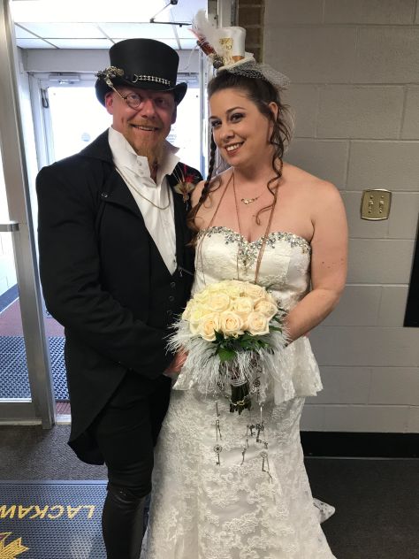 Christine and Al aren’t like other couples. They march to their own drummer and that is what makes them original and awesome! That was also very clear on April 29th, at a VFW Post, as I joined their steampunk wedding! When I walked in the door, I was immediately taken aback by how cool everyone looked! I didn’t know it was steampunk themed, so it was very exciting to see the decorations and the boots, coats, hats, monocles, etc. that were happening all around me. Al was so happy when I found him. Just an ear to ear grin and I knew that he could barely wait for this moment. Guests were gathering, almost all dressed to match the theme, and everyone seemed equally excited for the moment. Soon Christine arrived and hung out in the back, looking amazing, as she waited for her entrance. She was as excited as Al and I was started to get nervous that these two were really going to effect me emotionally. Well I wasn’t wrong there! Soon they were standing face to face and there were just tears everywhere! It was such a showcase of love and emotion that I really had to focus on not crying. They were just so happy! They also called all of their children up to talk about how much they loved them and how they would always be there for them. Looking out into the crowd I could tell this was effecting everyone. Their vows were so touching and they smiled as tears slid down their face. I really had to keep looking away to keep it together! Soon enough it was time to kiss and laugh and hold each other finally as a married couple. Congratulations Al and Christine! You are without a doubt made for each other and I know you’re going to have such a fun, happy life ahead of you. Thanks for letting me be a part of such an amazing day!