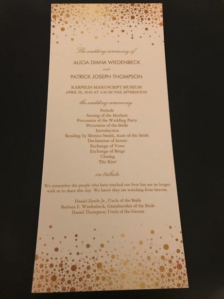 Guests took their time finding their seats. I love the manuscript museum because it’s beautiful and has such amazing sound, but I’m always a little sad doing ceremonies where the reception isn’t because I don’t get to see any of the amazing decorations or the cake. I think the cake is one of my favorite parts! But I made do until Alicia arrived, looking stunning and excited as she gathered with her bridesmaids in the great lobby. I made my way down to the front and picked up Patrick who at this point, was all emotion. I mean all of it. I think the moment his toes hit that alter, tears were welling up in his eyes. Then as parents walked down and their little baby son, there were some tears streaming down. But the moment he saw Alicia, we’re talking fully crying. I’m only human so it’s hard for me to watch and not get emotional! It’s just so beautiful!