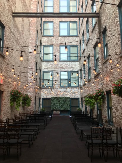 I found the happy couple in their rooms getting ready. They seemed pretty chill and honestly like they were having a good time already. I watched Katie and her bridesmaids pose for some pictures, and their reception room looked amazing. All we needed was to survive the very, very warm night in the courtyard and this would be a complete success. Guests started gathering and it was a happy and chatty bunch. There were hugs and laughs and I could tell everyone was very excited for this evening to start. And soon enough, David and I were standing there, watching Katie walk down the aisle and into his hands. They looked happy to see each other and I began the ceremony, adding a joke in that made them both look at me wide eyed before they burst out laughing. I think they actually missed the next 4 sentences I said because they kept joking more with each other about what I said. It was a perfect moment and I was happy to be a part of it. Finally though, with the warm air blowing around them, they were drawn to each other for their first kiss as husband and wife. Congratulations Dave and Katie! I know you’ll have a long and happy life ahead of you, and I wish you nothing but the best!