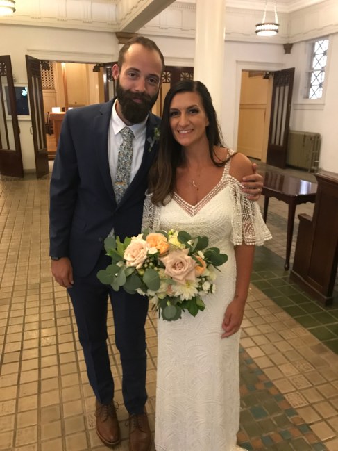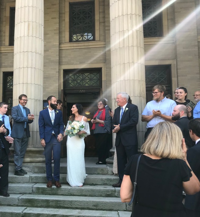September 2nd sounds like a fall wedding, but it was all summer in Buffalo, and gorgeous at the Karpeles Manuscript Museum. Danielle and Rick were there, eagerly awaiting their big moment. Danielle looking beautiful, hid out with her party downstairs. Rick was kind of on his own, and decided to head to a room behind the alter for some alone and quiet time before everything became crazy. He looked happily nervous and I liked that he wanted a moment to take everything in by himself. Eventually though, it was time to begin, so I got Rick and we headed to the alter to await Danielle. When she did come out, he somehow looked calmer and more nervous at the same time! I don’t even know how to explain it. They were so happy to see each other though, that they just about kissed at the alter! They went in for it, but then I saw Danielle realize, oh that’s for the end! It was really adorable and people laughed along with them. It was pretty steamy inside the building, but Danielle even reached out to dry the sweat from Rick’s brow. If that’s not love people, tell me what is! They listened to their readings with smiles and repeated their vows with clutched hands, and soon enough I was pronouncing them married! Congratulations Rick and Danielle! You’re such a well matched couple that I know there will be nothing by joy in your future. Best wishes always!