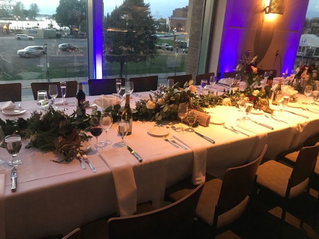 At the Lexus Club inside KeyBank Center, guest gathered for the big moment that had been cultivating for years. Also, Dana and Steve really know how to party, so I think people were pretty excited about that. We headed outside to a beautiful deck, which at that moment could have been a stand in for Cave of the Winds. Holy windy! As guests watched Dana’s runner blow in the breeze, they all worked together to lay things on top of it to keep it down. Love and teamwork is a beautiful thing. It was perfect for the wedding party and of course their dog, Stella, to make their way down. As I stood there with Steve, eventually it was time for Dana to make her appearance. She was absolutely gorgeous, especially with her veil soaring around in the wind. She made her way to Steve and they took hands, and I could tell they were nervous, but excited.