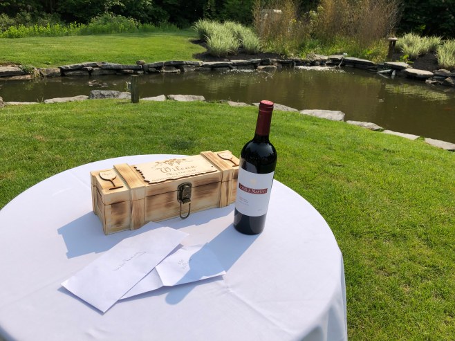 Things moved along quickly and soon enough Ryan and I were taking the long walk down the steps to the island. From there he was able to watch the wedding party walk down, with the girls ALWAYS looking nervous going down all those stairs, and had the best view to see his bride walk towards him. They seemed very moved as they saw each other, even though they had been spending time together upstairs, this moment is just different. The things are happening down there that you can’t even anticipate. They made it through their vows and over to their Wine/Love Letter Box, where they added love letters to each other and a bottle of wine to open on their first anniversary. It was a lovely moment and before I knew it, they were in each others arms sharing their first kiss! Congratulations Ryan and Amy! You’re a beautiful couple that deserved the beautiful day you got. Much love always!