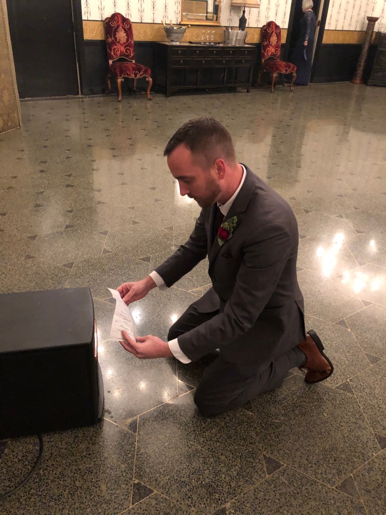 On November 15th, I found myself at Statler City for Lara and Luke’s wedding. An adorable couple, it didn’t matter if it was cold outside, or if the marriage license got ruined (more on that in a moment), the only important thing was that they were together and they were about to be married! They were hanging out together waiting for guests to arrive. They had done their first look and photos and were warming up and laughing with their wedding party, when I had to come and ruin it by asking for the marriage license. Luke realized they must have left it in the limo, so they were calling around trying to get it to turn back. Luckily, it did and a groomsman went down to fetch it. When he came back up he was like, I GOT IT, and also the ice bucket spilled all over it. It was soaked and seemed ruined, and for the next 10 minutes, he knelt in front of the space heater until it dried out. That’s how you pick your party people.