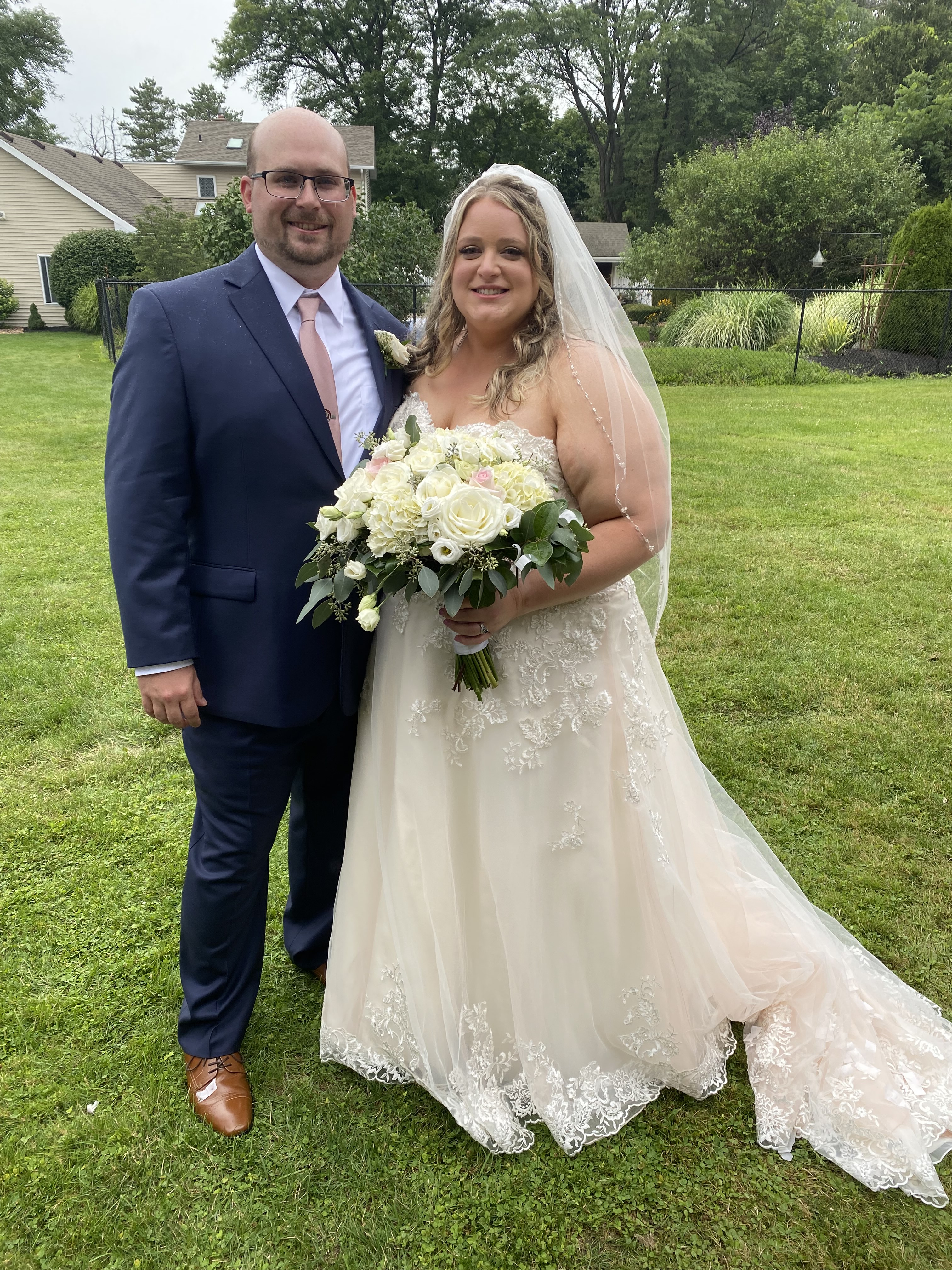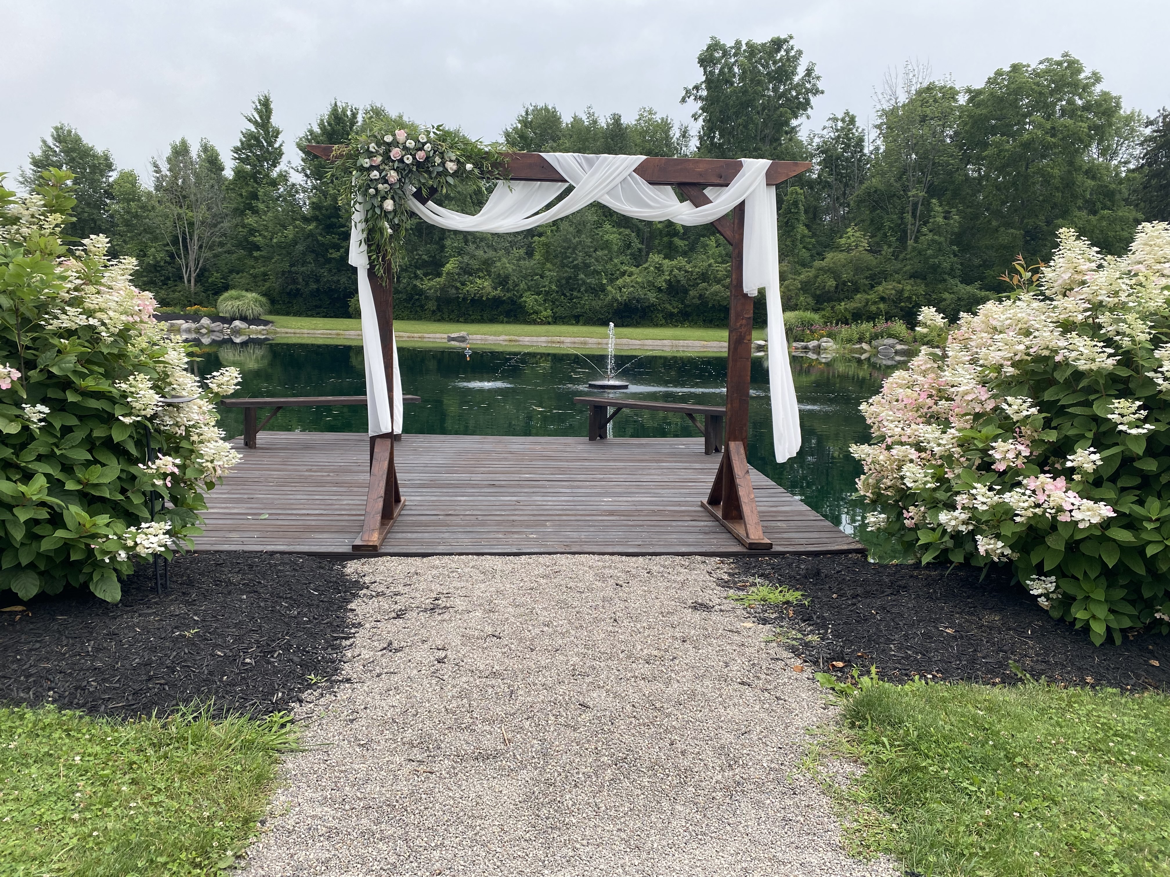 July 24th was threatening rain, but it was so green and beautiful in Stafford, NY, in Samantha’s parents backyard, it was hard to remember to be nervous about it. When I arrived I found Sam chillin’ with her bridesmaid’s (and the cutest sleepy puppers), and getting excited about things starting. Tim took me around to see how things would work in this amazing space, and I gawked at what a pretty alter it was with a giant pond behind them. It did start to sprinkle a little bit as Sam was walking, but she looked so beautiful I’m not sure anyone noticed. They smiled at each other and read their beautiful vows and I was reminded how magical these moments can be. It may be raining on you, but who cares when you’re telling your person how much you love them. It reminds you what is important in life. After I sped up my talk a bit (I didn’t want then too wet), it felt like no time before they were kissing as husband and wife! Congratulations Tim and Samantha. You’ve been together a long time and this seemed like a moment that was worth waiting for for. Best wishes always.