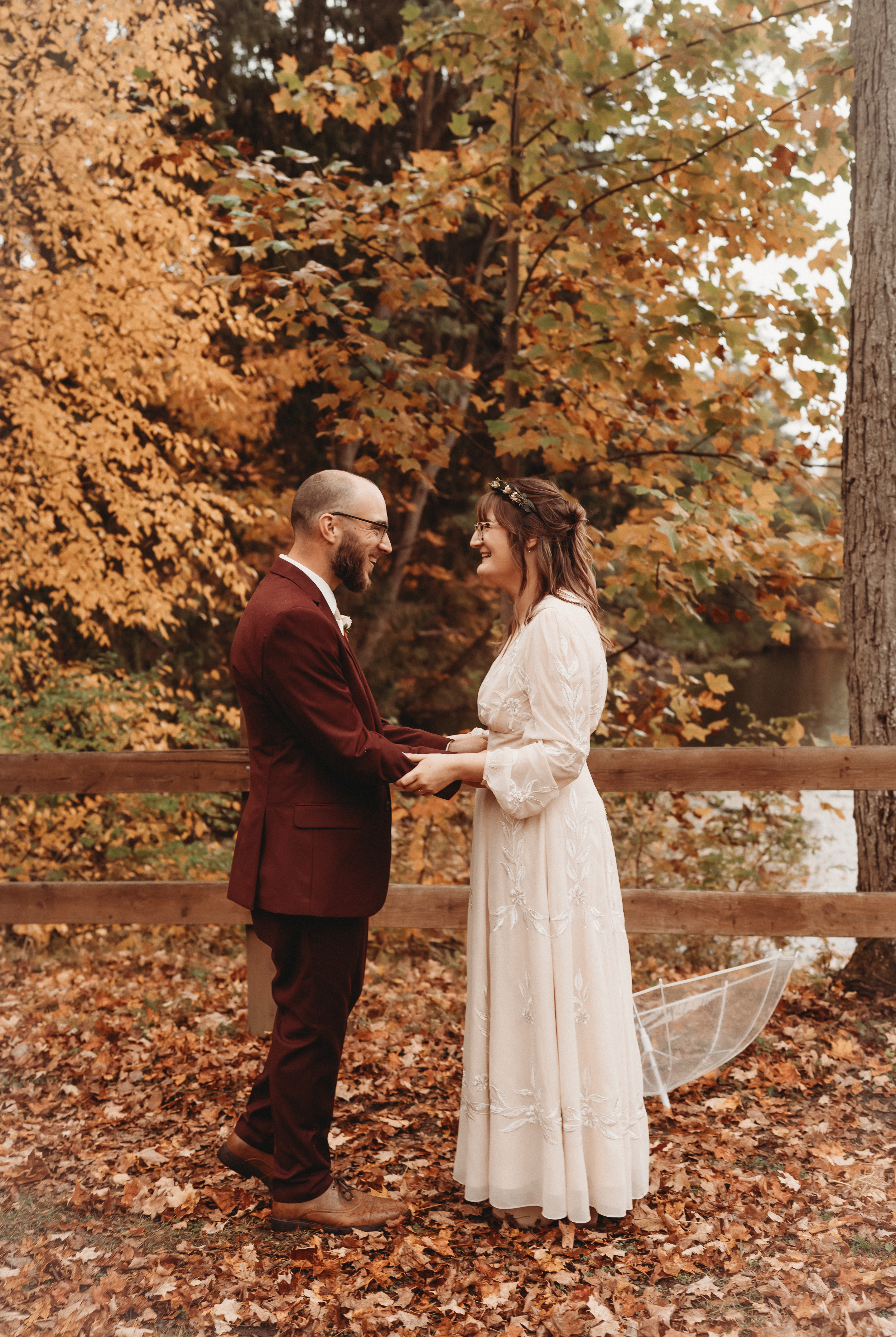 You know what I love? A morning wedding! So I was thrilled on October 20th to find myself, at 11:00am, at the Commissioner’s Cabin in Chestnut Ridge. If you haven’t discovered this place yet, you are missing out! It’s the coziest cabin, with a roaring fire, a perfect sized kitchen, room for tables and guests and some dancing, while outside it’s trees and falling leaves and a pond. Truly, a dream place. I’m always so happy when I find myself here for a wedding. And when the wedding is Lauren and Adam’s, it’s just the cherry on top.